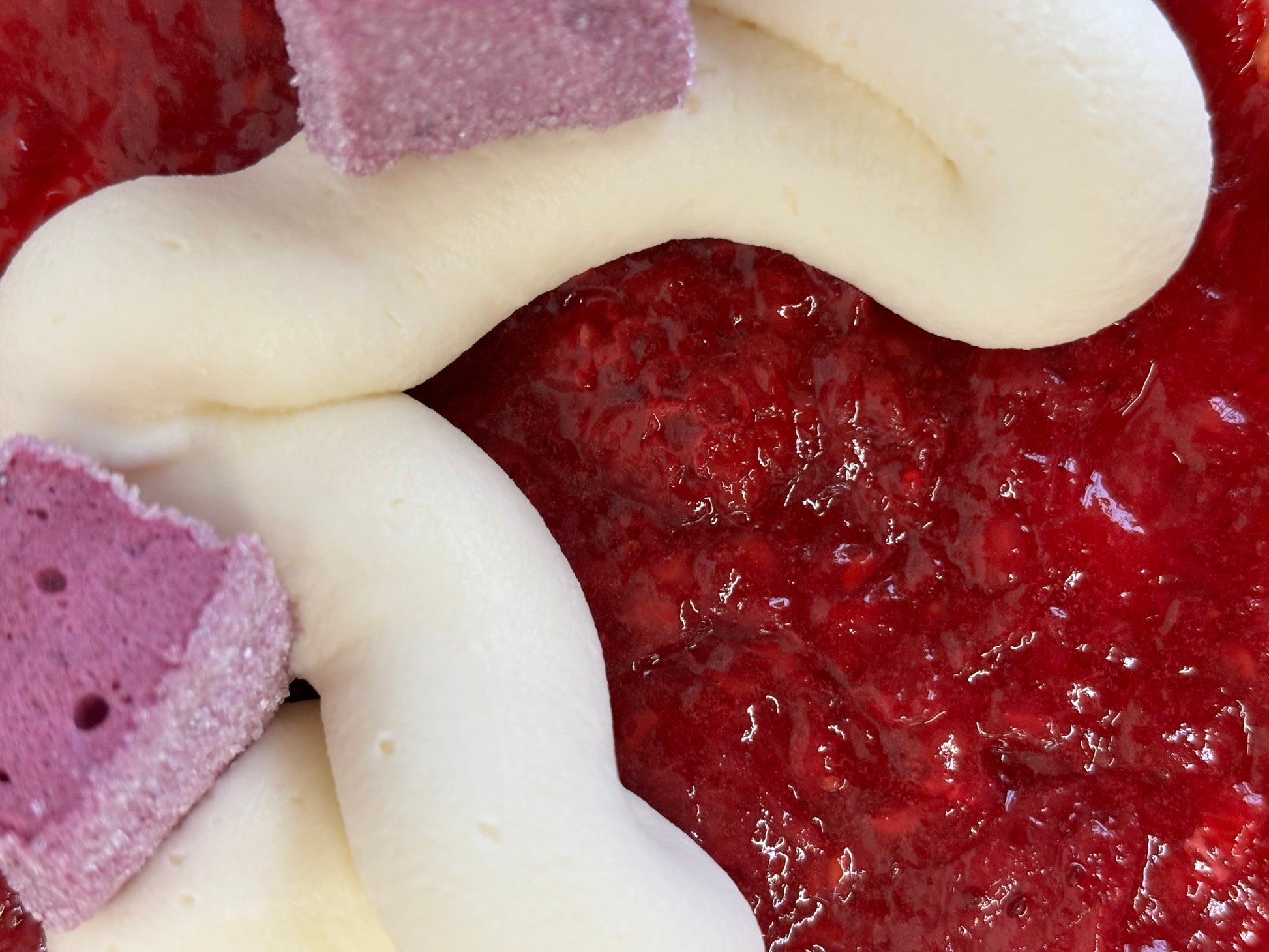 Fromage à la crème, oeufs, beurre, fraise & framboise du Québec, crème sûre, farine non blanchie biologique, sucre de canne biologique, chocolat Zéphyr 34%, cassonade, miel, pectine NH, sel. Décor: crème 35%, chocolat zéphyr 34%, camerise, sucres, gélatine.