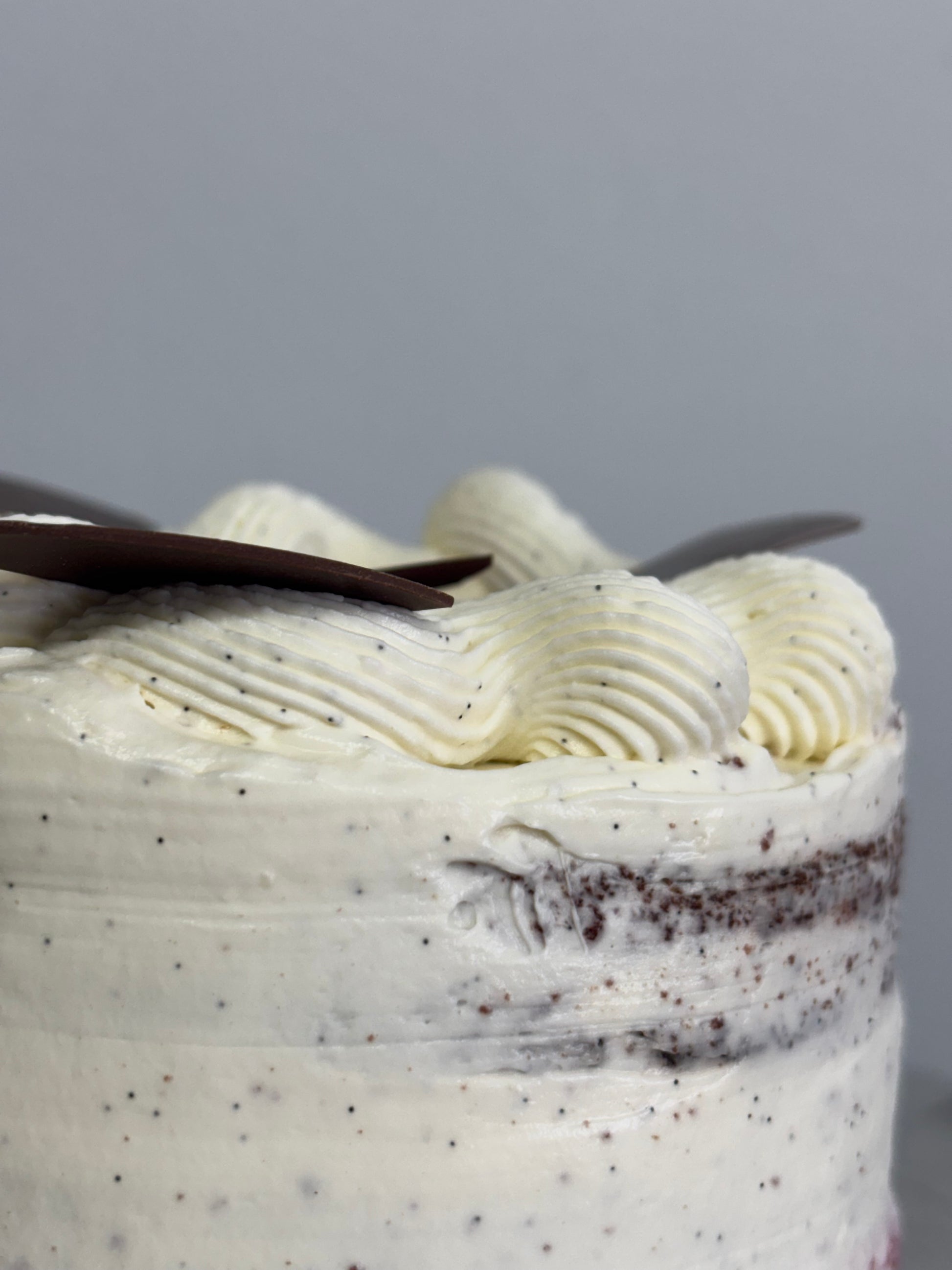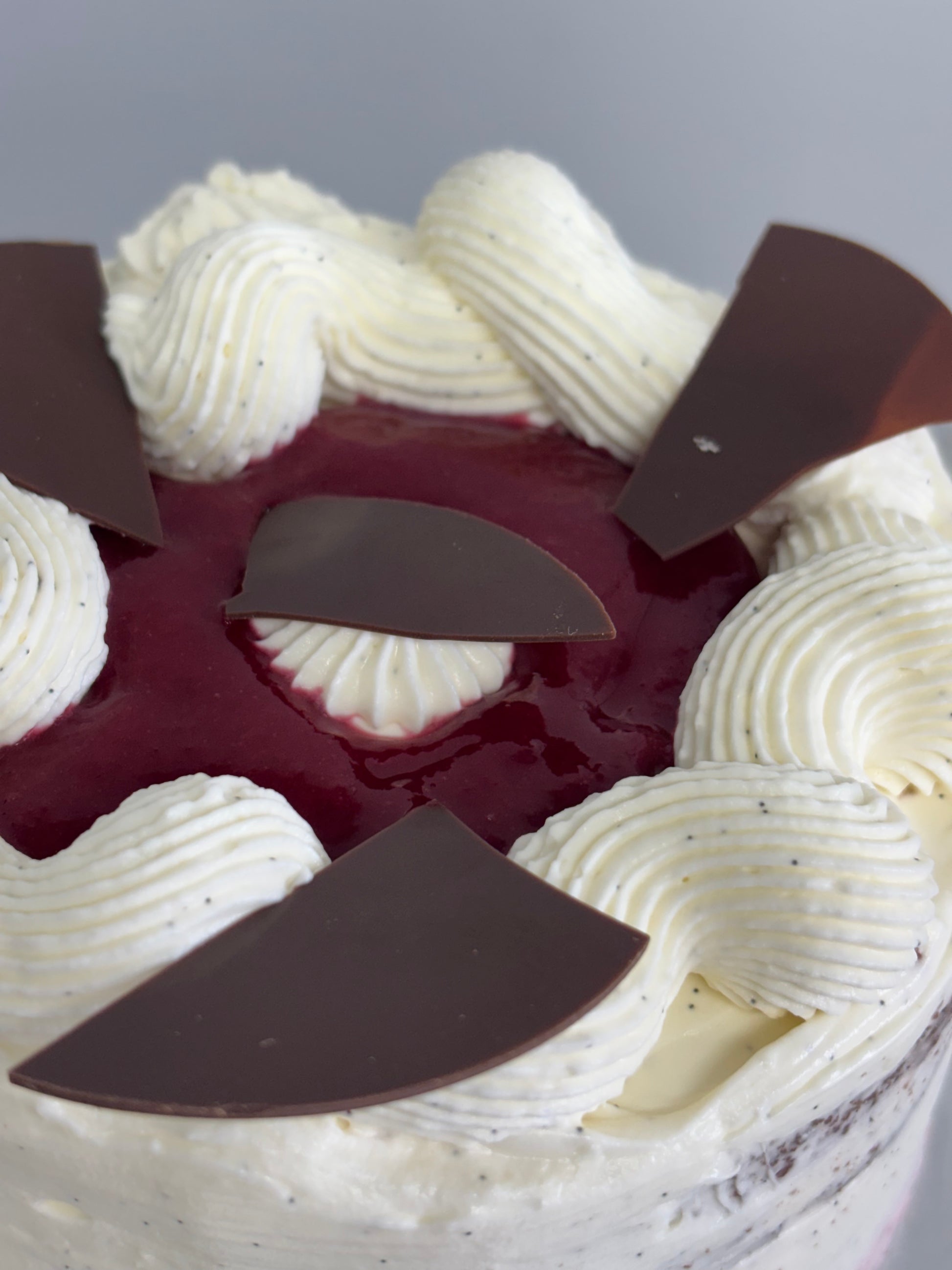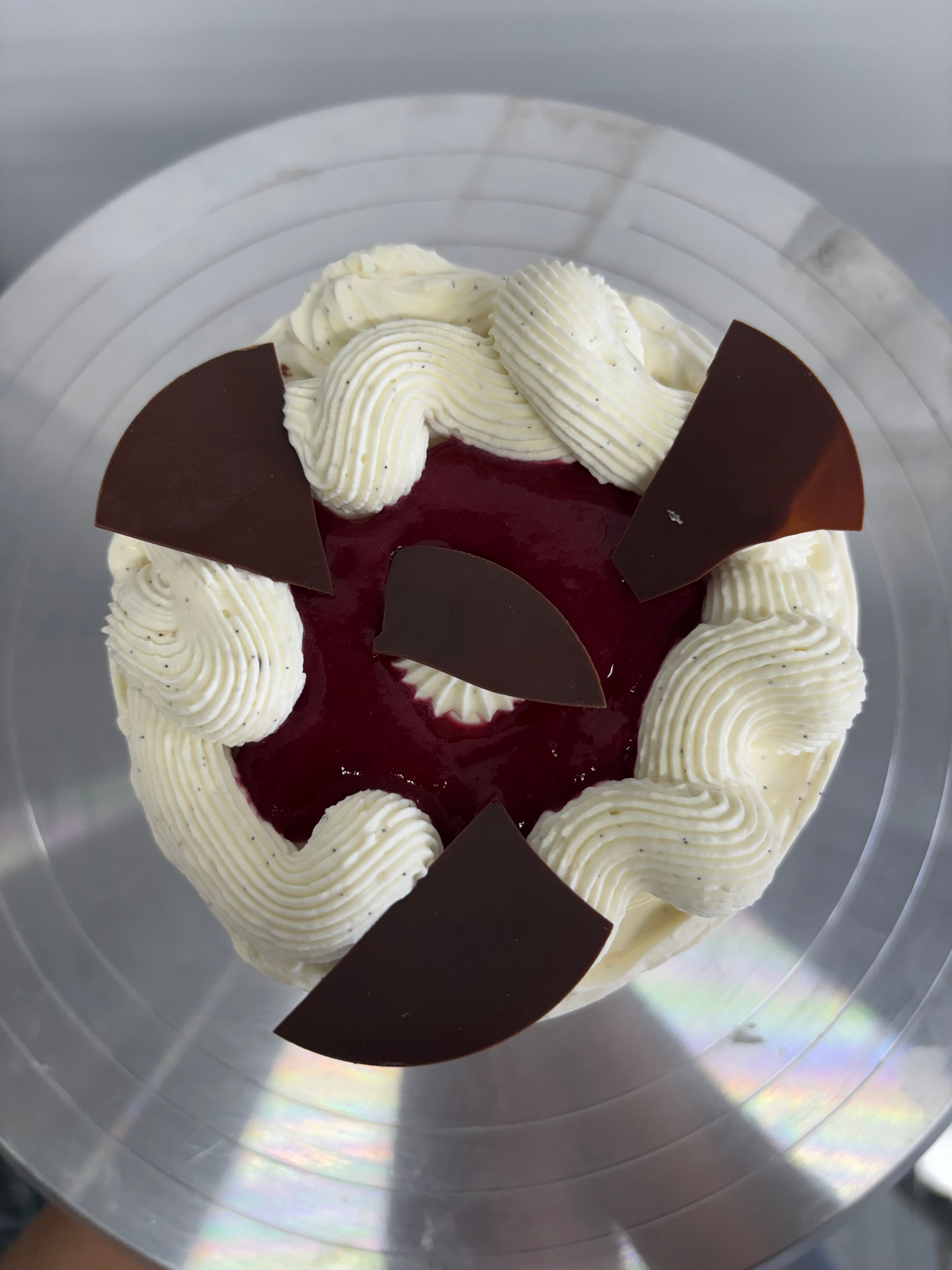 Un gâteau chocolat ultra moelleux avec une chantilly mascarpone et vanille de Madagascar le tout garni avec un confit de fraise et framboise du Québec, l'accord parfait pour un dessert en douceur.